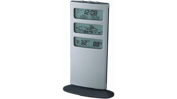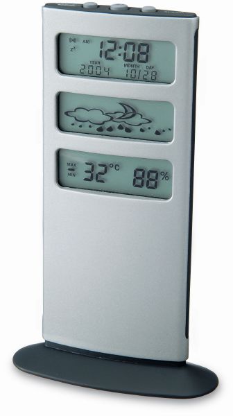 Desk Weather Station. 3 Display weather station featuring time, alarm with snooze function, calendar, humidity, C/F temperature and weather forecast. Metal.