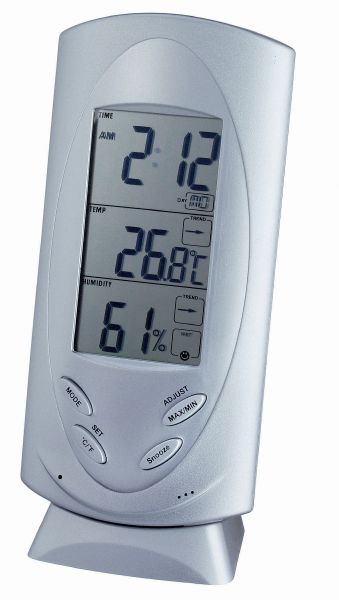 Weather Station. Featuring time, humidity, temperature C/F, alarm with snooze, date, temperature trend indicator and humidity trend indicator.