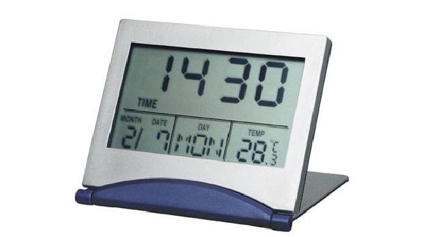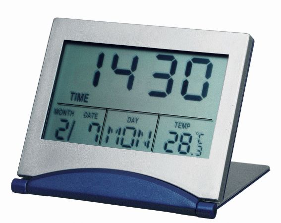 Foldable Alarm Clock. Small, foldable alarm clock with snooze function, timer, C/F thermometer, calendar and 12/24 hour indication.