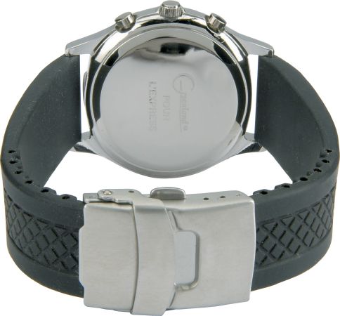 Monza Gents. Japanese chronograph movement with date. Functions : 1/10 sec, second and minute. Case dimension : 38 mm. Dial print diameter : 26 mm. Brushed chrome metal case with brushed chrome turning bezel. 3 ATM water resistant. 20 mm black silicone strap with expandable buckle.