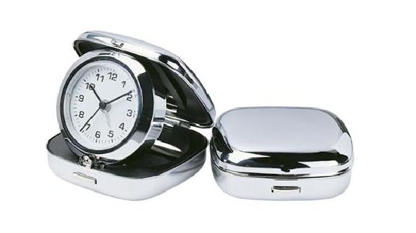 | Features : | Pop-up system analogue alarm clock in nice aluminium casing. With velvet pouch included. |