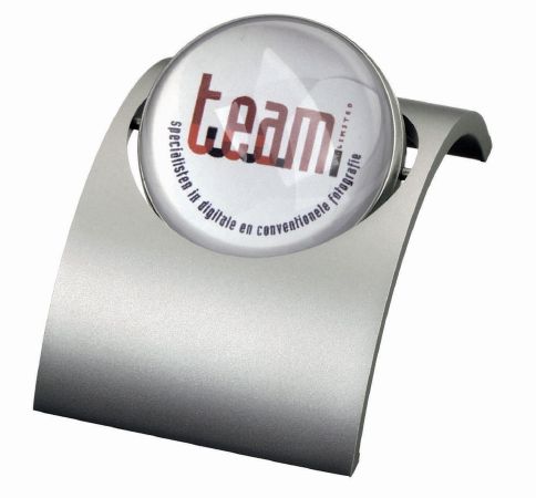Magnifying Rotating Desk Clock. The glass magnifies time and the logo imprint on the other side. Metal.