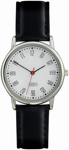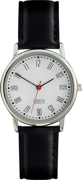 London II Gents. Case dimension : 34 mm. Printing diameter : 27 mm Calendar and rotating disk as options. Metal case with shiny chrome finish. 18 mm black padded leather strap.