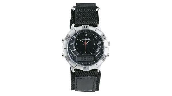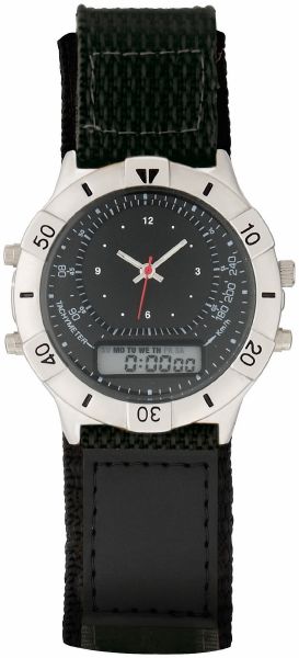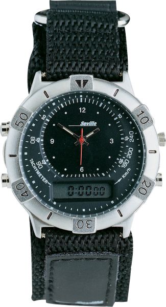 Seville. Digital functions : calendar,date, month and year, chrono with minutes, seconds, and 1/100 sec, elapse time, alarm facility. Case dimension : 39.25 mm. Printing diameter : 14 mm. Brushed chrome metal case with rotating bezel. Black mask. 3 ATM water resistant. 20 mm black Velcro strap.