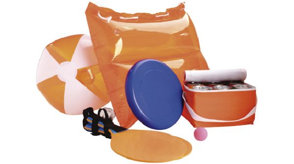 Beach Set. Frisbee. Beach paddles with ball. Cooler bag (holds 6 cans). Inflatable beach ball. Inflatable pillow bag.