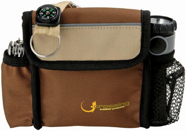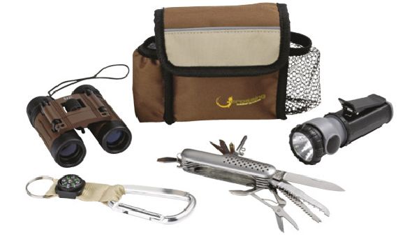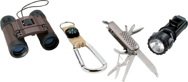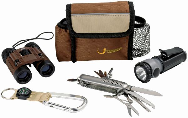 Crossing 6 pcs Outdoor Set. 8 x 21 Binoculars, torch, Karabiner with compass and multi function knife in pouch. 600D polyester.
