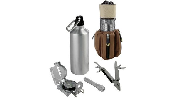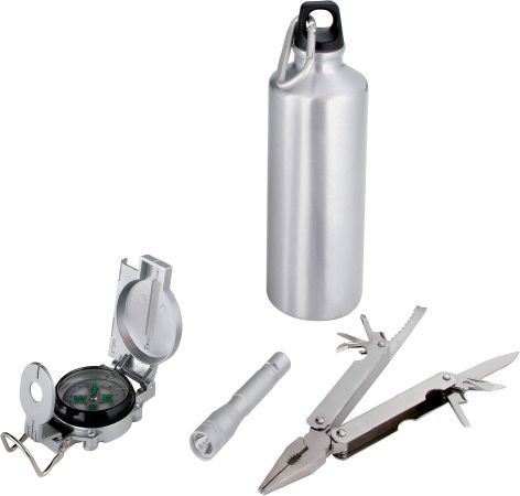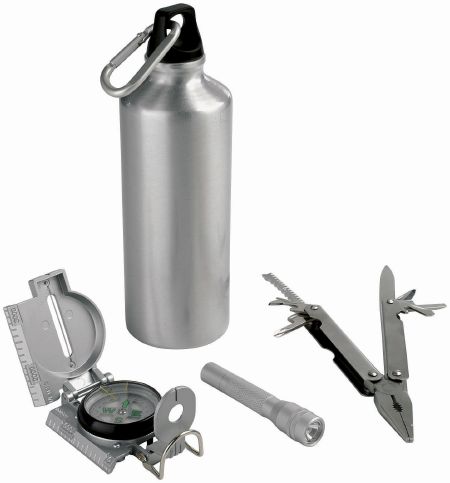 Crossing 6 pcs Outdoor Set II. Aluminium bidon with Karabiner, compass, torch and 15 functions knife in pouch. 600D polyester.