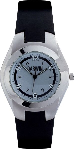 Darwin. Case dimension : 48.4 mm x 37.5 mm. Printing diameter : 23.9 mm. Metal case with shiny chrome finish. Black PVC strap.