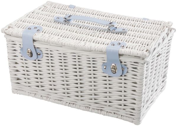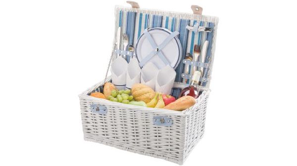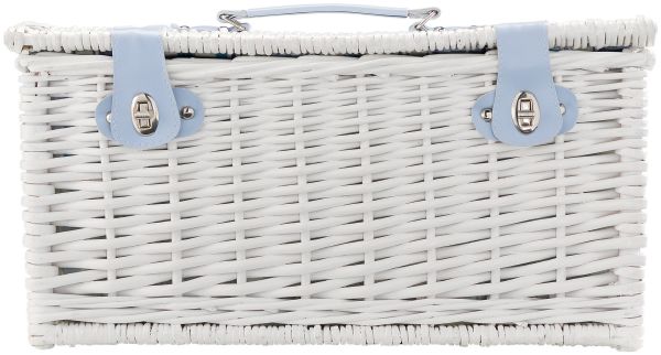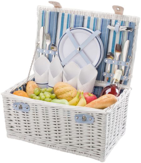 | Features : | White willow basket with blue striped lining on the inside. Suitable for 4 persons. Content consists of 4 plastic plates, 4 plastic mugs, metal cutlery (knives, forks, tea spoons), waitress knife and 4 cotton napkins. |