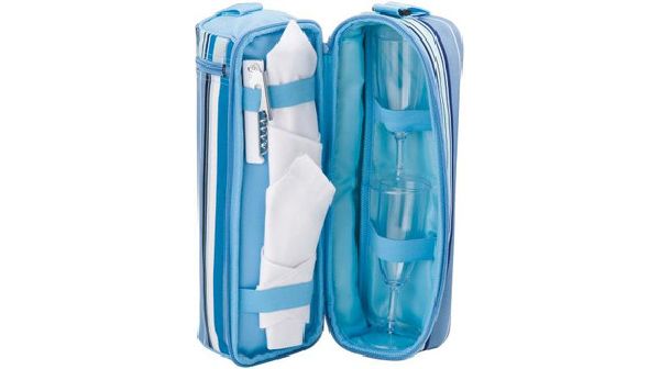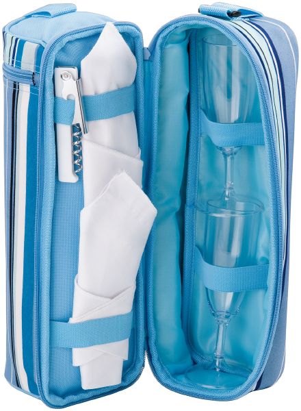 Riviera Wine Cooler. This Riviera wine cooler is complete with a bottle opener, 2 napkins and 2 clear wine glasses. You only need to add your favourite bottle of wine. 300D polyester.