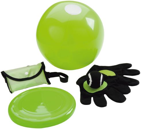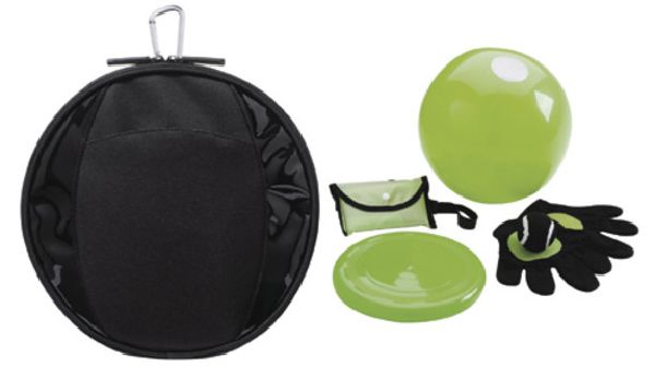Game Set. This game set contains everything you need for a playful day out: frisbee, beach ball, kite, velcro ball and glove set. The durable carrying bag has a velcro pocket on the front as well as a karabiner so it can be hooked onto a belt or backpack for easy transport. 600D polyester / PVC.