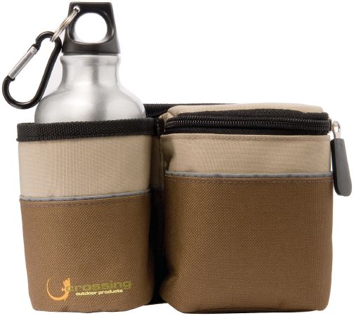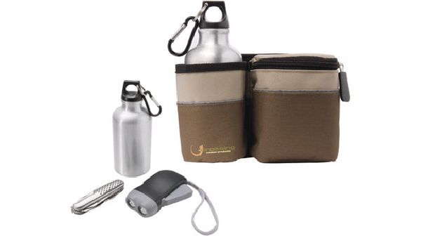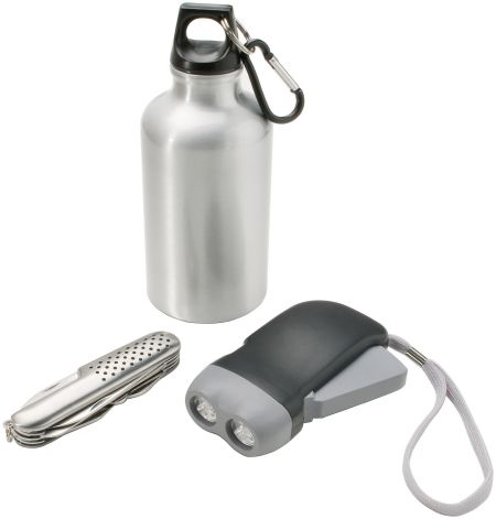 Crossing Survival Set. A great outdoor gift set including a 12 functions survival knife, cranking torch and bidon with karabiner. The pouch can be attached to your belt. 600D polyester.