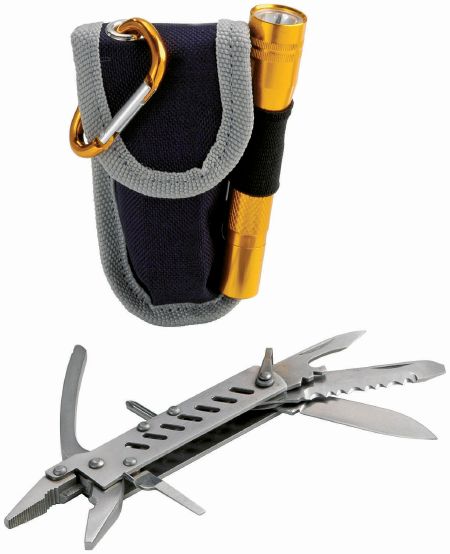 Outdoor set. 9 Function knife in pouch with belt loop, torch and karabiner clip. Requires 1 x AAA Battery (not included).