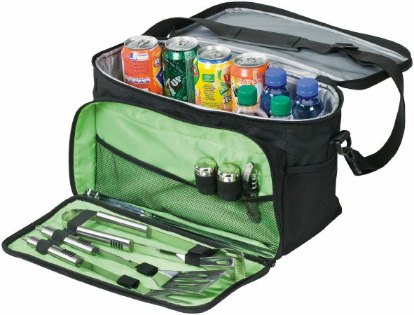 BBQ Cooler Bag. This cooler bag has 9 pcs BBQ accessories inside. Polyester / PVC.