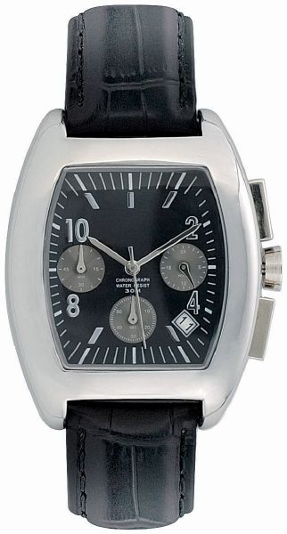 Elite. Chrono movement (1/1 sec) with date. Case dimension : 39.36 x 38.50 mm. Brass case. 3 ATM water resistant. 20 mm black imitation croco leather strap.