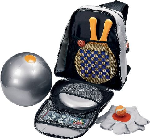 Rucksack With Beach Games. This trendy rucksack is stuffed with games: chess, backgammon, a beach game, inflatable beach ball, throw-and-catch game and a frisbee. 420D polyester.