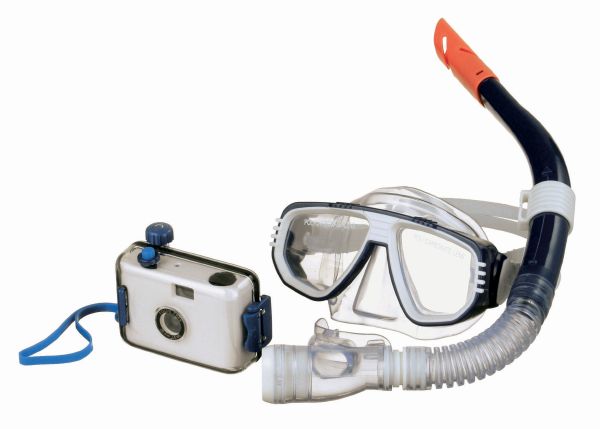 Snorkel Set. Snorkel and re-usable underwater 35 mm camera in rucksack. Film not included.