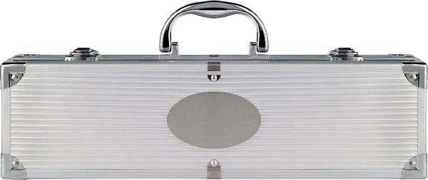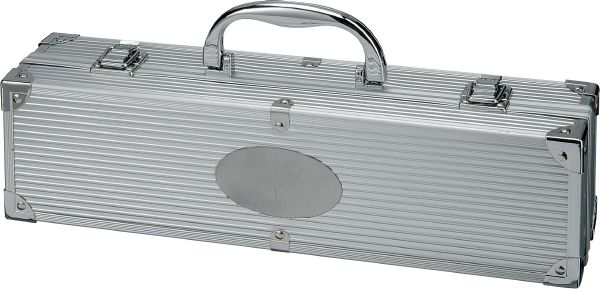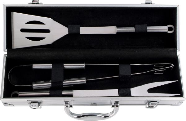 3 Pcs BBQ Set. Spatula, tongs and fork in metal case with engraving plate.