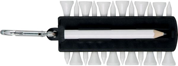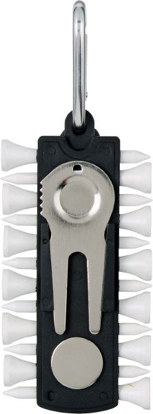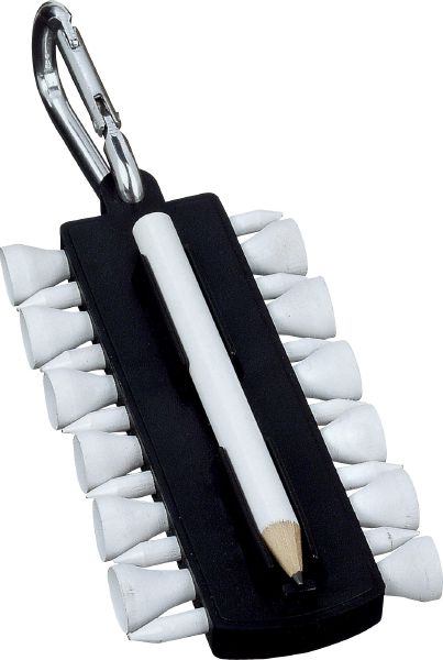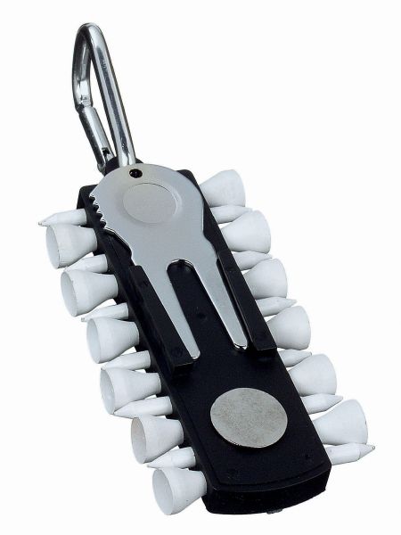 Golf Tee Holder. Holder with 12 tees, marker and pitch fork with cleaner. Hook it on your belt or golf bag with the karabiner.
