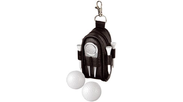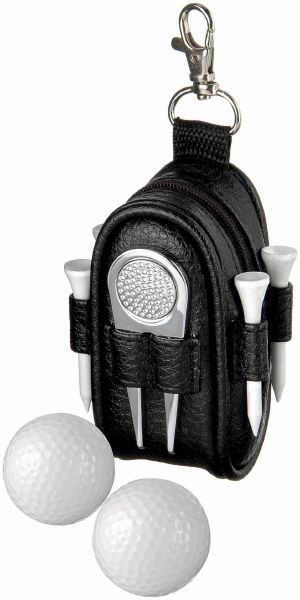 Golf Gift Set. Imitation leather pouch with 4 tees, pitch fork with marker and 2 golf balls.