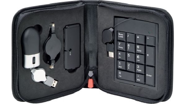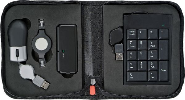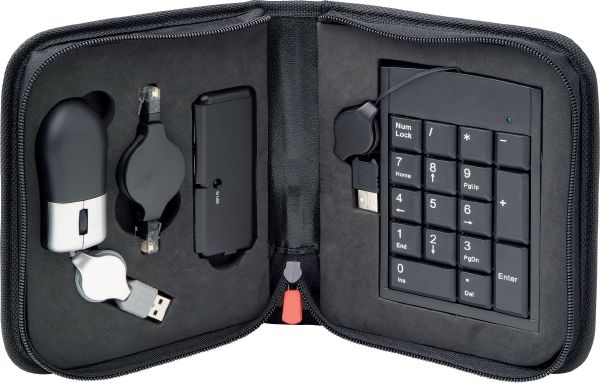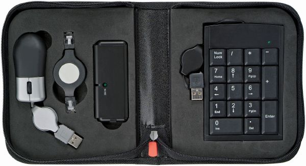 Computer Set. Microfiber case with key pad calculator, 4 ports USB Hub, mini optical mouse and extension cord.