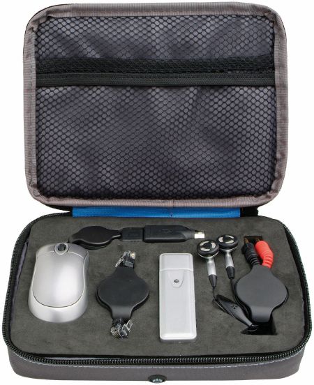 Tech Business Bag. This nicely designed business bag comes with a pouch that includes Mini optical mouse, retractable LAN extension cord, retractable internet phone and card reader which can be place in front pocket.